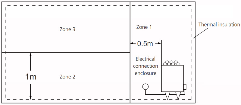 In accordance with the relevant international standards set down in the 2004 Edition of IEC 60364-7-703, the zones of a sauna are changed from Temperature Zones A, B, C and D to Zones 1, 2 and 3. Zone 1 extends to the ceiling above the sauna heater.