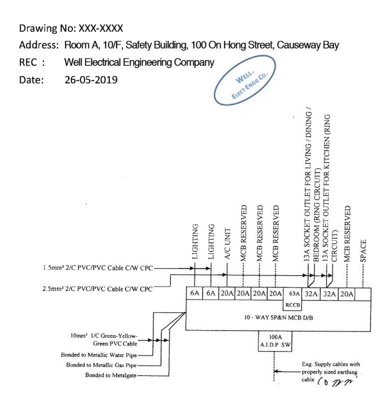 According to the Electricity (Wiring) Regulations, a fixed electrical installation shall, after completion of repair, alteration or addition, and before it is energised for use, be inspected, tested and issued with a Work Completion Certificate (Form WR1) by the responsible REW to confirm that the technical and safety requirements of the relevant Regulations have been met. The REW should also submit the duly signed Work Completion Certificate for endorsement by the REC that employs him. The REC should properly keep the certificate for a period of at least five years.
