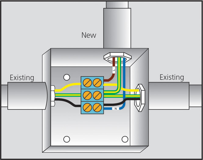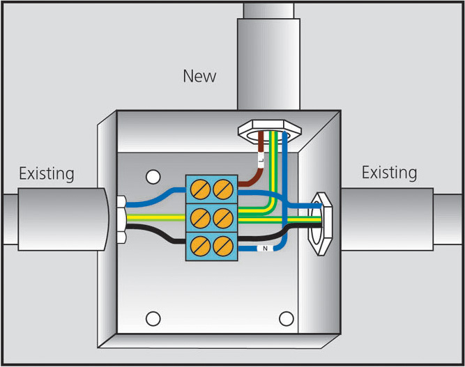 Figure 4 - Extension, alteration and repair to an existing single phase installation, where existing phase conductors are identified by red colour b. Existing cables adopting either yellow or blue for phase and black for neutral