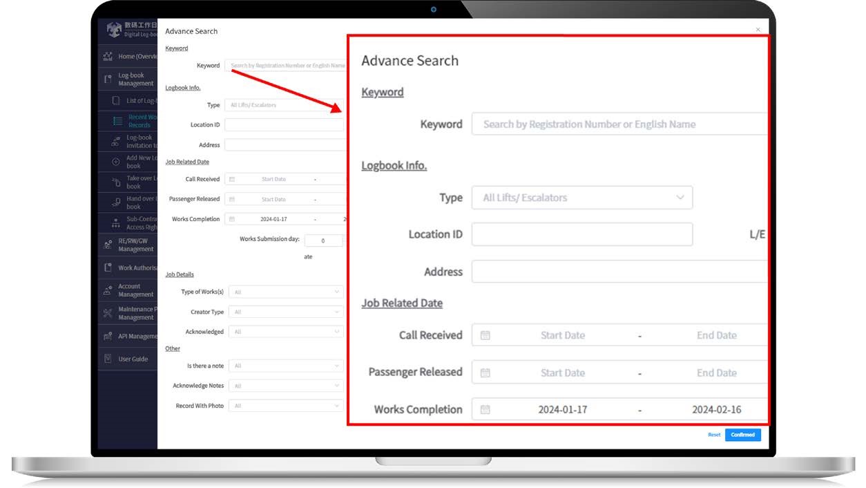 An “Advanced Search” function has been added to the web portal of the Digital Log-books. Using this function, RPs and RCs can filter the search results by selecting multiple criteria, including time and location of the works, type of works, name of contractor etc., so as to gain quick access to works requiring attention and its details for better facility management.