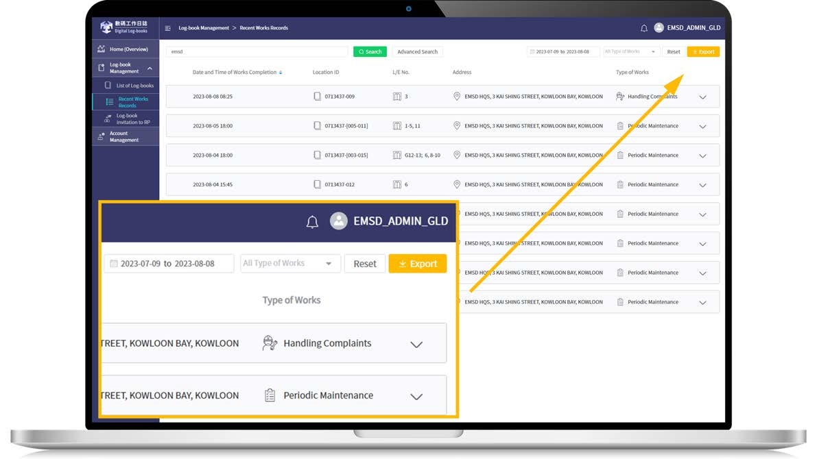 An “export” function has been added to the web portal of the Digital Log-books. Using the function, RPs and RCs can export log-book records to Microsoft Excel, which facilitates further analysis of the log-book data for better facility management.