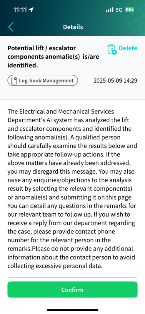 The Lift and Escalator Condition Analysis System (LECAS) applies artificial intelligence to analyze the condition of lift and escalator components captured in the photos uploaded to the Digital Log-books by RP/RE/RW. If potential anomalies are found, the Digital Log-books system would issue smart notifications to the user who uploaded the photos to facilitate timely checking and repair.