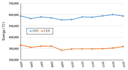 "Final energy requirements" (FER) refers to the amount of energy consumed by final users for all energy purposes such as heating, cooking and driving machinery. It differs from PER in that the latter includes all energy used or lost in the energy transformation and the distribution process.