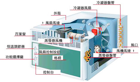 房间冷气机(例如窗口式和分体式冷气机)是住宅类楼宇最常用的空调系统。整个製冷循环都在冷气机中完成。下图为窗口式冷气机的内部结构。