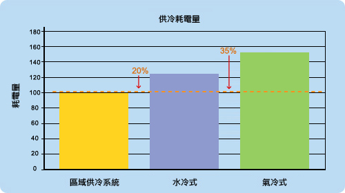 區域供冷系統是非常節能的供冷方案,充分利用規模經濟效益、不同建築物對冷氣需求的差異、以及設備操作和維修的高標準。區域供冷系統的節能量取決於其佈局,例如配給管道的長度、排熱方法和其他設備的效能改善計劃,但是與與傳統氣冷式空調系統及獨立使用冷卻塔的水冷式空調系統比較,區域供冷系統可分別節省約35%及20%的用電量。