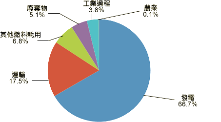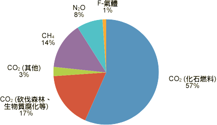 - 二氧化碳:很多人類活動都會排放二氧化碳,當中以化石燃料的燃燒過程產生最多,例如燃燒煤、石油和天然氣來產生電力、驅動運輸工具和運行工業生產設備等等。