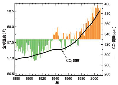 太陽的能量影響著地球氣候的轉變,並可導致地球表面溫度上升。但相反,地球能以輻射的形式把能量輻射返太空。然而大氣層中的溫室氣體,尤其是二氧化碳,就像溫室的玻璃板一樣,限制了部分能量由地球向太空散失。這部分能量積聚在大氣層中,從而導致全球氣候暖化問題。於1906至2005年間,地球表面溫度上升了0.56至0.92°C。