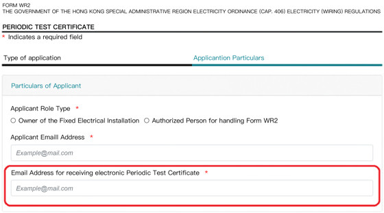The owner of the fixed electrical installation or his/her authorised person fills in the application form and uploads the documents required, such as the schematic wiring diagram and checklist. As the owners of fixed electrical installations will receive the electronic periodic test certificates by email after the endorsement is completed, applicants are reminded to provide valid email addresses. |