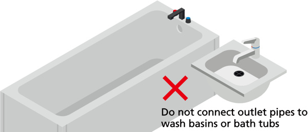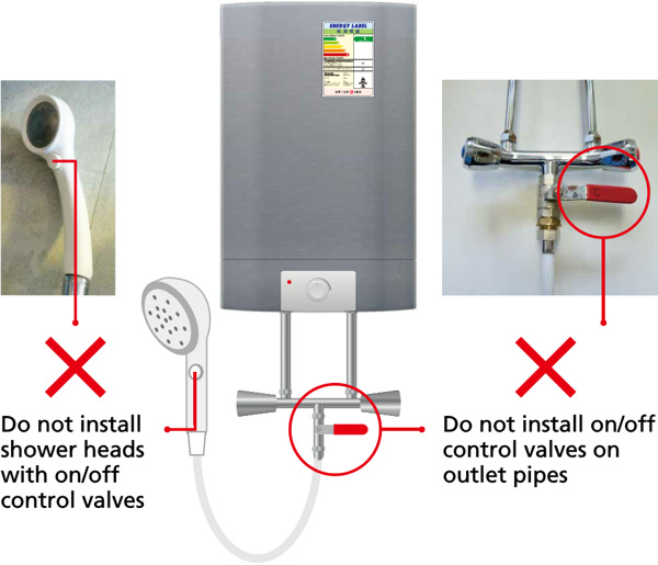In recent years, there has been an occasional occurrence of domestic accidents involving "shower storage type" electric water heaters, with most accidents caused by improper installation of heater fittings (i.e. outlet pipes, mixing faucets and shower heads). Please be reminded that the mixing faucets and shower heads installed on "shower storage type" electric water heaters must be produced or approved by the original manufacturers of the heaters. In addition, do not install shower heads with on/off control valves or massage function on "shower storage type" electric water heaters, install on/off control valves on outlet pipes or connect outlet pipes to wash basins or bath tubs, in order to prevent the storage tanks of the heaters from explosion due to excessive pressure.