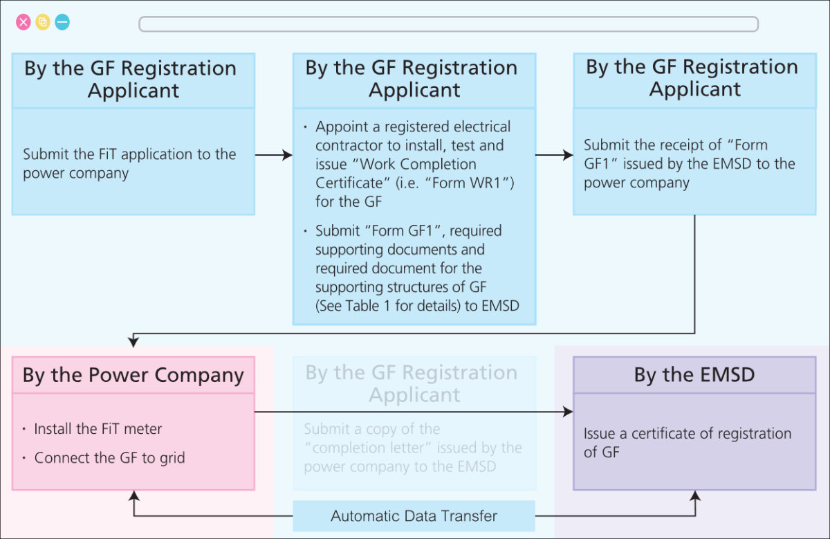 Under the new GF registration application process, the GF registration applicant has to submit “New Application for Registration as Generating Facilities” (i.e. “Form GF1”) together with the required document for the supporting structures of GF stipulated by the relevant government departments Note2 (e.g., Safety Certificate of Photovoltaic System Installed on Roof / Roof of Stairhood of New Territories Exempted House submitted to Lands Department, Acknowledgement Letter for certification on completion of relevant minor works issued by Buildings Department / Independent Checking Unit under the Office of the Permanent Secretary for Housing or Acknowledgement Letter for certification on completion of relevant alteration and addition works issued by Buildings Department / Independent Checking Unit under the Office of the Permanent Secretary for Housing) to ensure compliance with the relevant structural safety requirements.