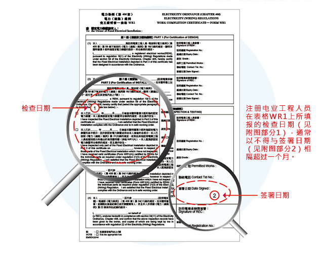 - 注册电业工程人员在表格WR1上所填报的检查日期(见附图部分1),通常以不得与签署日期(见附图部分2)相隔超过一个月。