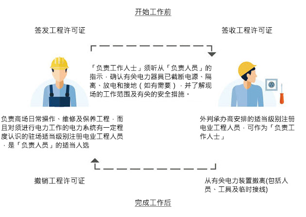 以商场为例,负责商场日常操作、维修及保养工程,而且对须进行电力工作的电力系统有一定程度认识的驻场适当级别注册电业工程人员,是「负责人员」的适当人选,因为他须按守则4的安全规定,截断电源、隔离、放电和接地(如有需要),以确保「负责工作人士」可以在不带电的情况之下安全地进行电力工作。