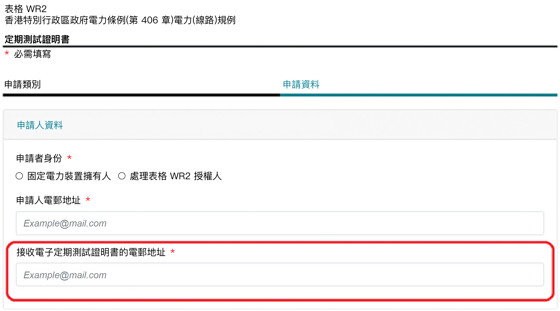 固定电力装置拥有人或其授权代表填写申请表格,并上传所需文件,例如电路图和核对表。 由于在完成加签后,电子定期测试证书会以电邮方式发给固定电力装置拥有人,因此务请申请人提供有效的电邮地址。 |