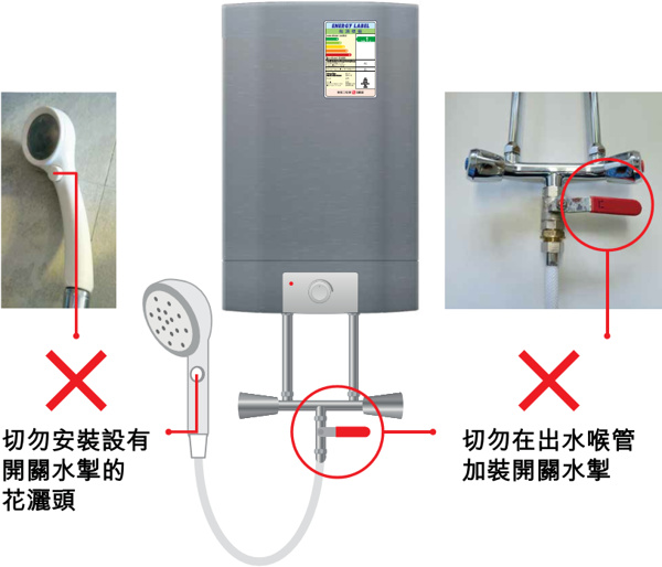 近年涉及「花洒储水式」电热水器的家居意外偶有发生,当中大多是因为电热水器配件(即出水喉管、出水混合掣及花洒头)安装不当而引致。请紧记,安装于「花洒储水式」电热水器的出水混合掣及花洒头必须由原厂制造或获生产商认可。此外,切勿在「花洒储水式」电热水器安装设有开关水掣或有按摩功能的花洒头,也不要在出水喉管加装开关水掣,并且不得把出水喉管接驳至洗手盆或浴缸,以免电热水器的储水缸因压力过大而爆炸。