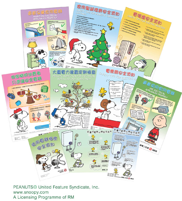上一期《 电力快讯》 曾提及, 本署会在日后的一系列公众教材内, 采用世界着名的「 花生漫画/ PEANUTS 」 人物( 包括着名卡通「 史诺比/ Snoopy 」 ), 希望增加趣味性, 令我们能更有效地向市民宣传家居电气安全的知识。 到目前为止, 本署推出了共10 款有关的教材( 包括7 款海报、 1 本小册子及2 款单张) , 其内容涵盖不同的家居电气安全范畴。