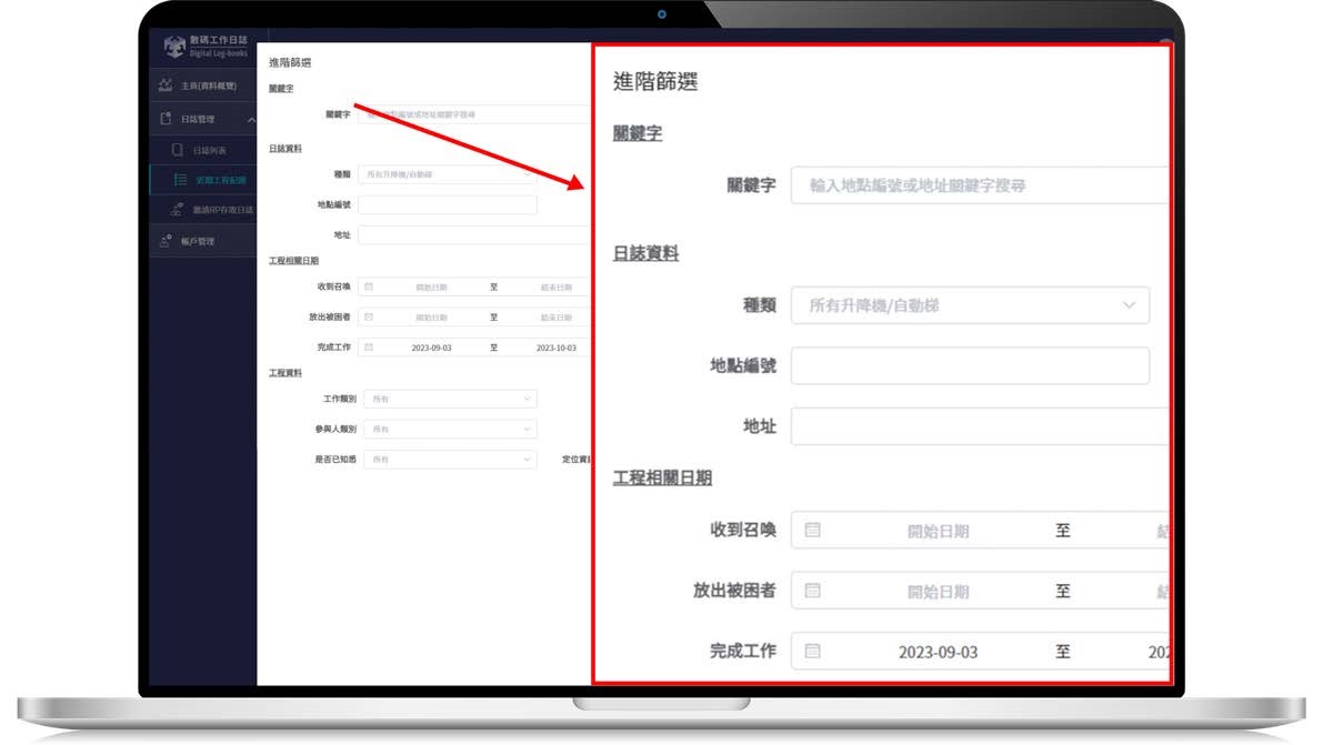 数码工作日志的网上平台新增了「进阶筛选」功能,让负责人和承办商自订多种条件(包括工程时间和地点、工作类别、承办商等)作筛选,以便快速地了解需要关注的工作及细节,做好设施管理。