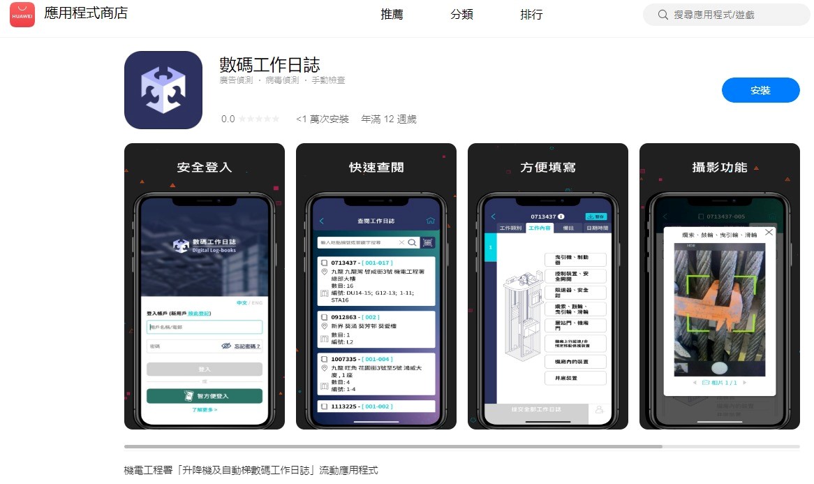 机电署已推出与鸿蒙作业系统(HarmonyOS)相容的数码工作日志流动应用程式。使用鸿蒙作业系统的数码工作日志用家,可透过「华为应用程式市场」(Huawei AppGallery)下载及使用数码工作日志流动应用程式。