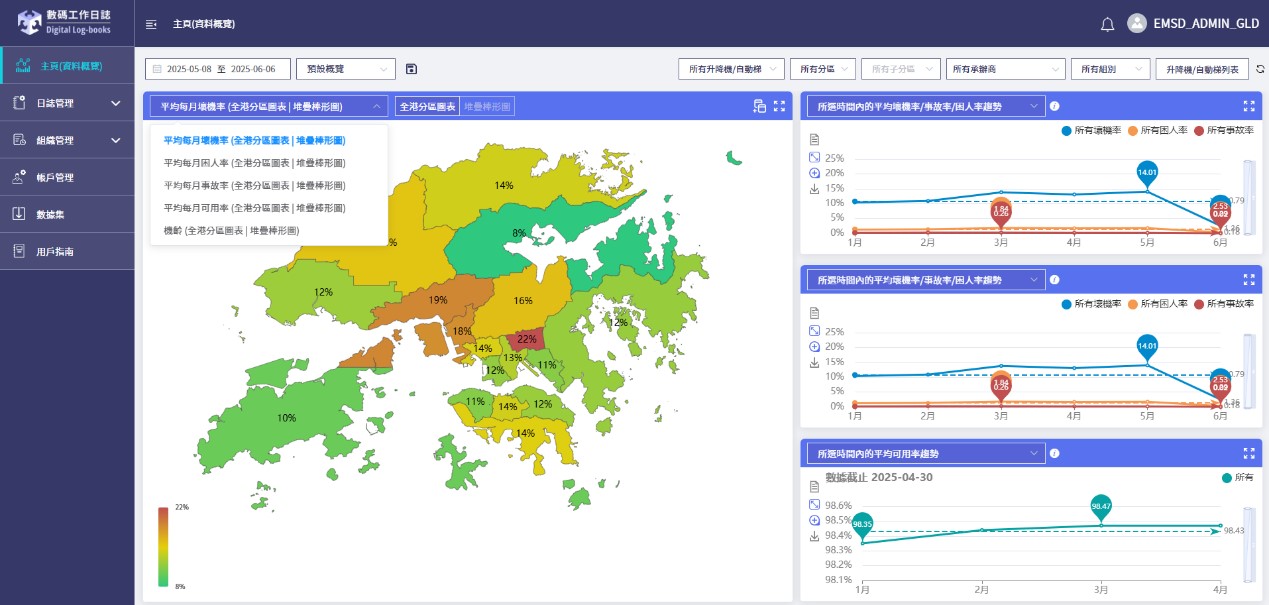 数码工作日志新增了「升降机/自动梯综合指数」的评分机制,它整合了与升降机/自动梯运行表现相关(如坏机率及困人率)以及与从业员及负责人的工作表现相关(如准时提交工作的次数)的各项数据,以分析及比较升降机/自动梯的综合表现,从而协助负责人、业界及机电署更有效地监察升降机/自动梯的运作及管理水平。