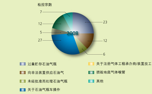 2008年的检控种类,有关石油气瓶车操作、及过量贮存石油气瓶的个案最多,而关于损毁地底气体喉管、及向非法装置供应石油气的个案次之。检控种类分析有助我们定出优次,向业界进行劝籲守法的宣传工作。