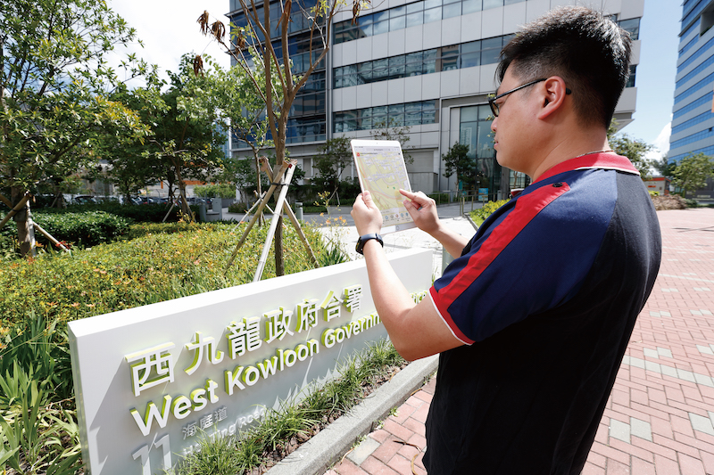 Our colleagues are demonstrating the use of a Geographic Information System-based Digital Documentation System at the West Kowloon Government Offices. With the use of positioning technology, the system enables prompt and accurate retrieval of technical information in a building, thereby enhancing the efficiency of maintenance work.