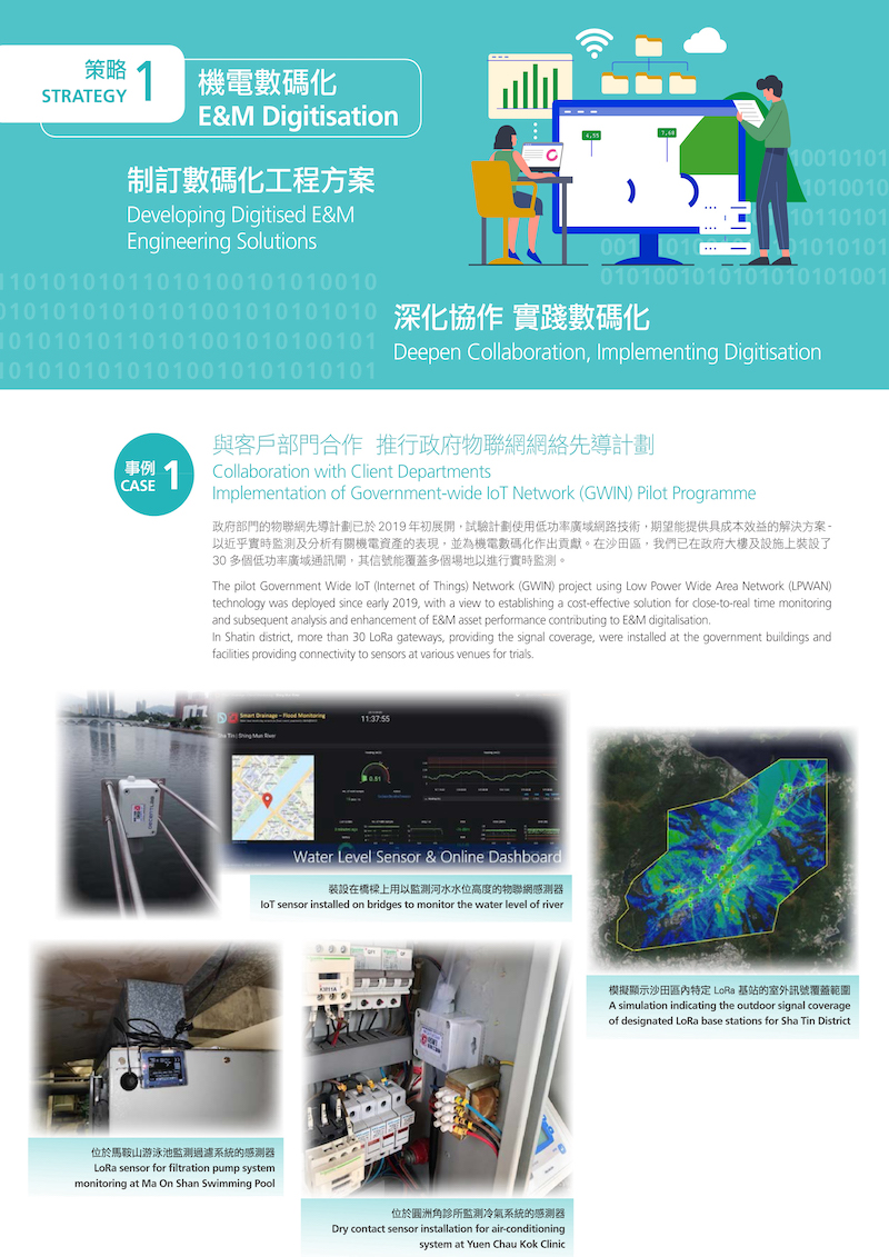 We develop the pilot project, Smart Drainage — Flood Monitoring System, which uses the technology of IoT and new type of sensors, with the Drainage Services Department to monitor real-time water level status at different storm surge spots and overtopping wave spots.