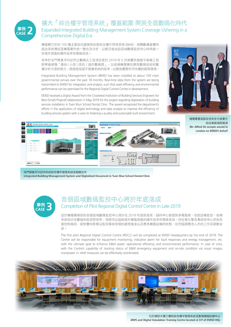The first Regional Digital Control Centre at the EMSD Headquarters offers various services, such as remote equipment monitoring, fault alert, energy management, etc., to enhance operational efficiency and energy efficiency of our clients’ E&M assets.