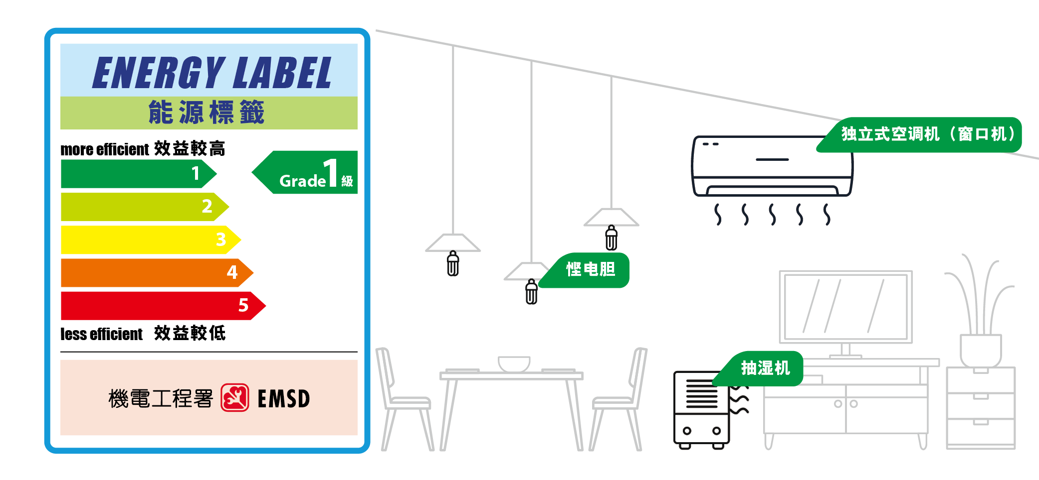 我们于2009年透过《能源效益(产品标签)条例》推行「强制性能源效益标签计划」第一阶段,规定所有订明产品供应时须贴上能源标签以展示其能源效益等级,为消费者提供产品的相关能源效益资讯,鼓励他们选购高能源效益产品。