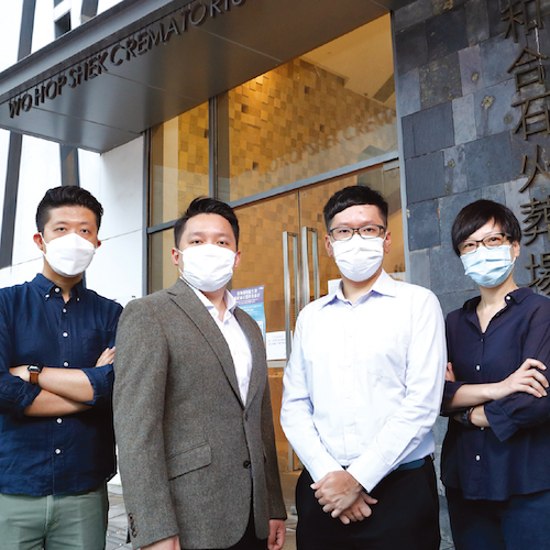 工程师张立鸿先生(左二)、助理工程师冯镇国先生(右二)与团队研发一套获奖的「人工智能优化火化流程系统」。该系统利用影像分析及人工智能技术,优化各火化时段,减少所需时间及燃料消耗。
