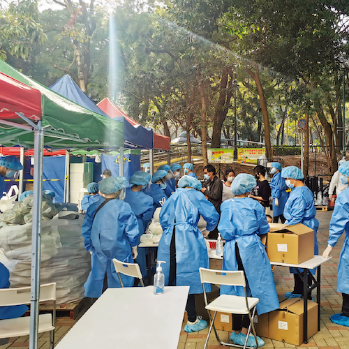 团队的首次「围封强检」行动,于3月3日至4日在德朗村德莹楼进行。由于在行动前数天才获通知,吴女士必须与时间竞赛,在极短时间内采购充足物资,包括供同事使用的个人防护装备、快速抗原测试包,以及派发给目标大厦住户的中成药包和罐头食品。吴女士解释说:「我们通常备存两套物资,一套供即将展开的『围封强检』行动使用,另一套是备用物资,供下次行动使用。」