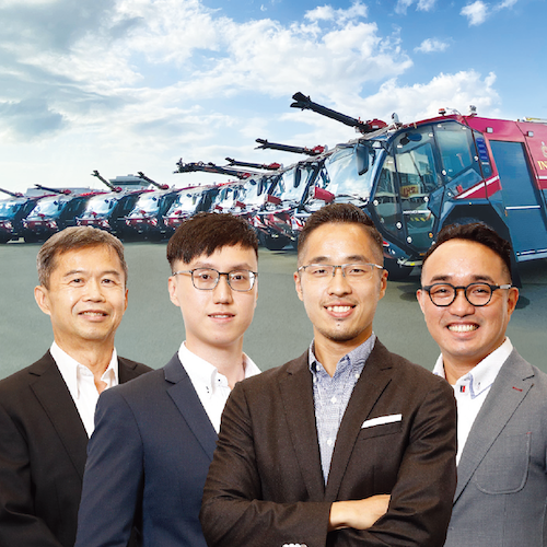 黄宇康先生(右二)及其团队于2022年年初远赴奥地利,协助消防处进行飞机救援及灭火车的测试及校验工作。旅程期间障碍重重,当地天气恶劣,而且受疫情影响,团队的行程被打乱,尽管如此,团队仍排除万难,确保车辆如期交付。
