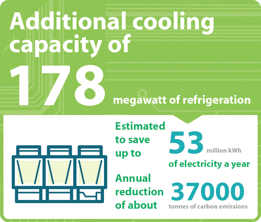 EMSD’s DCS project moved a step further with the support of the then Environment Bureau to provide additional cooling capacity of 178 megawatt of refrigeration for the Kai Tak Development, bolstering the cooling capacity of the existing North and South DCS Plants. Upon full utilisation, the additional DCS project is estimated to save up to 53 million kWh of electricity a year, representing an annual reduction of about 37000 tonnes of carbon emissions.