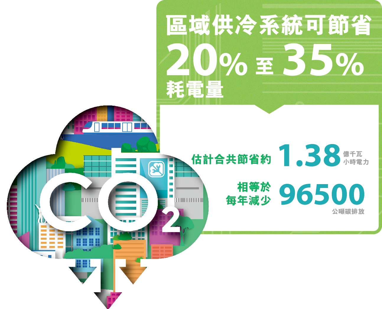 區域供冷系統可為一個地區多座建築物供冷,被視為高能源效益的供冷方案。一般而言,區域供冷系統較獨立安裝在個別建築物上的傳統中央空調系統可節省20%至35%耗電量,碳排放也相應減少。機電署總部大樓自2013年開始使用啟德區域供冷系統服務,於2021/22年度估計合共節省約1.38億千瓦小時電力,相等於每年減少96500公噸碳排放。
