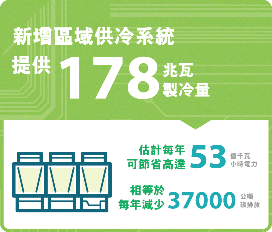 年內,機電署的區域供冷系統項目在環境局(時稱)支持下跨進新里程碑。新增區域供冷系統項目可為啟德發展區額外提供178兆瓦製冷量,提升了現有南廠和北廠的供冷能力。該系統全面投入服務後,估計每年可節省高達5300萬千瓦小時電力,相當於每年減少約37000公噸碳排放。
