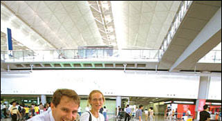 happy family arrives in cosmopolitan Hong Kong. |