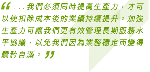 回顧2007/08年度,成本上升是首要挑戰。雖然機電服務的需求並非完全受經濟周期所影響,但一如其他行業,通脹會輕易蠶食我們的利潤。對於營運基金的收入增長潛力,我一直抱樂觀態度。我們的客戶基礎穩固,每個客戶的業務只要輕微增長,營運基金的整體收入的增長便很可觀。不過,我們必須同時提高生產力,才可以使扣除成本後的業績持續提升。加強生產力可讓我們更有效管理長期服務水平協議,以免我們因為業務穩定而變得驕矜自滿。