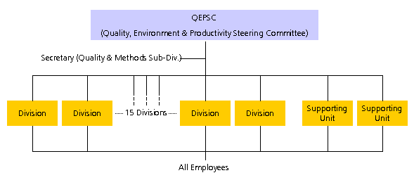 In addition to our dedication to environmental conservation and protection, we are also committed to providing and maintaining a safe environment for employees. To fulfil this commitment, the QEPSC was established in 1996. It is chaired by an Assistant Director with members from each Division/Strategic Business Unit (SBU) and supporting units. The steering committee receives broad-term directives from senior management and is responsible for establishing environmental, safety, quality and productivity initiatives. These initiatives are then cascaded to member representatives who will be responsible for the coordination, implementation and promotion of these initiatives in their respective units, and also for reporting back to the QESPC for approval. ˇ@ ˇ@ ˇ@ ˇ@ ˇ@ | ||||