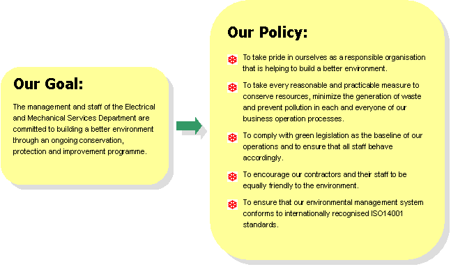 As a good corporate citizen, the Department has put in place its Environmental Goal since 2000. Established by senior management in consultation with EMSD employees, it describes the Departmentˇ¦s environmental vision and objectives. To ensure that this Goal is fulfilled, EMSD has drawn up an environmental policy. The policy is reviewed from time to time by the Quality, Environment and Productivity Steering Committee (QEPSC) and approved by senior management.