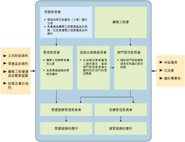 機電工程署有雙重角色。我們的營運服務(即機電工程營運基金)為本港各政府部門及公營機構提供專業、可靠及具成本效益的電氣、機械、電子工程及屋宇裝備服務。而我們的規管服務則在電氣、機械及氣體工程方面提供規管架構,執行各種安全法例及推廣公眾安全教育,保障市民安全。