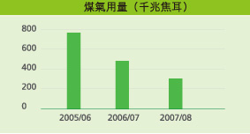 煤氣一直以來都是前加路連山總部和九龍廠供應熱水的主要燃料。自從總部遷往九龍灣後,由於新總部大樓運用多種系統取得熱水,包括熱泵、電熱水爐及太陽能熱水系統,我們的煤氣用量由2006/07年度起開始下降。目前加路連山工場是唯一仍以煤氣取得熱水的主要場地。加上我們加強執行內務管理措施,煤氣用量持續下跌至2007/08年度的約317,000兆焦耳。