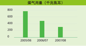 煤气一直以来都是前加路连山总部和九龙厂供应热水的主要燃料。自从总部迁往九龙湾后,由于新总部大楼运用多种系统取得热水,包括热泵、电热水炉及太阳能热水系统,我们的煤气用量由2006/07年度起开始下降。目前加路连山工场是唯一仍以煤气取得热水的主要场地。加上我们加强执行内务管理措施,煤气用量持续下跌至2007/08年度的约317,000兆焦耳。