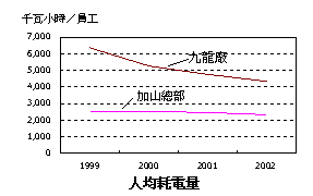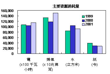 根據統計數字,我們的用水及用紙量較2000年度分別減少了10.6%及4.5%。 由於拓展新業務及新維修站投入運作,本署的氣體及電力消耗量均有所增加,不過, 加山總部和九龍廠的人均耗電量則自1999年起持續下降。