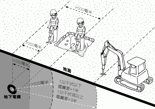 (b) 機械挖掘機及其他工具 — 電壓為132千伏以下的地下電纜,與其方圓保持1米距離;電壓為132千伏或以上的地下電纜,則與其方圓保持3米距離。