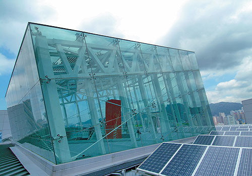 總部大樓天台安裝了全港最大規模的太陽能光伏板,觀景台則佇立其中。