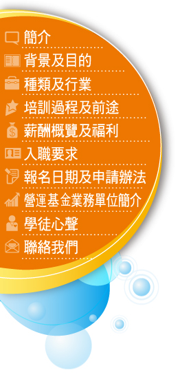 聯絡我們 學徒心聲 營運基金業務單位簡介 報名日期及申請辦法 入職要求 薪酬福利 培訓過程 種類及行業 背景及目的 簡介