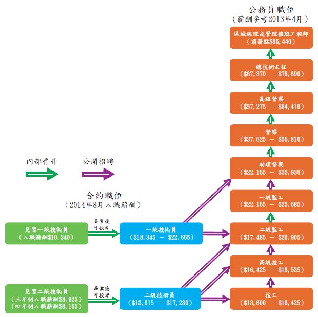 培訓過程見習技術員訓練計劃為期三至四年。一方面會被安排到不同的前線服務單位,如:醫院、機場、大會堂、泳池、運動場館等,接受機械、電氣、汽車、空調、電子或屋宇裝備等多個專業範疇的實務訓練,由富經驗的技術人員培訓工藝技能。另一方面會被保送往職業訓練局修讀相關的證書/文憑課程,補充技術理論的知識,讓學員能成為理論及技術兼備的人材。 見習技術員在受訓期間,我們有專責訓練的導師安排他們的訓練計劃,並定期審視他們的進度及提供指導。見習一級技術員約三至六個月轉換營運基金業務單位一次,而見習二級技術員約每年轉換營運基金業務單位一次,讓他們能學到多方面的技術;另外,除卻接受本身行業的實務訓練外,部門亦會提供綜合技能訓練(電氣、機械、冷氣及電子)及有關行業的安全訓練,讓他們具備廣泛的技能。見習技術員只要完成訓練計劃,在職業訓練局修讀達至要求水平,並通過結業前的技術水平測試,便可獲頒發見習技術員畢業證書。 就業前途•見習一級技術員於完成訓練期後,一般可投考一級技術員•見習二級技術員於完成訓練期後,一般可投考二級技術員 下表所列為機電工程署見習技術員有機會晉升之職級及其薪酬