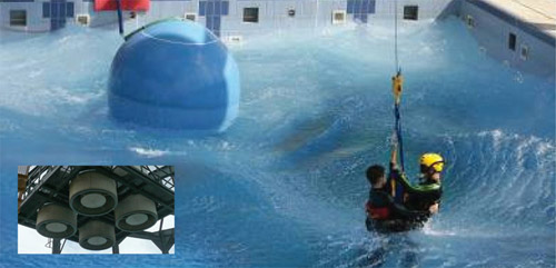 At the Diving Base, a helicopter downwash simulation fan system generates strong winds like those from a helicopter's rotary blades while a wave generation system produces waves up to 1.8 metres high, creating conditions very similar to those rescuers encounter at sea. The helicopter winching simulator brings the rescuer to save the life of the swimmer.