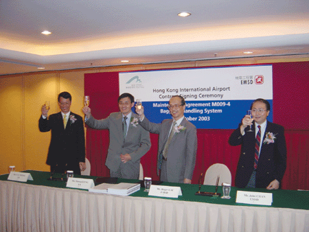 EMSD Director Mr Roger Lai (second from right), Deputy Director Mr John Chan (first from right) and AA Airport Management Director, Mr Howard Eng (second from left) and Head of Technical Services and Procurement Mr Y. F. Wong (first from left) propose a toast to the guests at the contract signing ceremony.