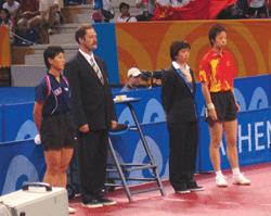 詹美芬(右二)与奥运冠军中国选手张怡宁(右一)在决赛中合照。