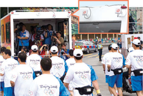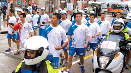 火炬传送的启步仪式于尖沙咀香港文化中心广场举行,康乐及文化事务署特意在该处竖立一具10米高的模拟火炬,供市民及游客参观及拍照纪念。机电工程署因应该署需要,为模拟火炬的外围装设四组节能的发光二极管射灯,让火炬在黑夜中闪耀维港。
