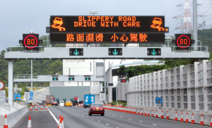 八号干线往尖山隧道入口的可变车速标志及可变道路标志。 |
